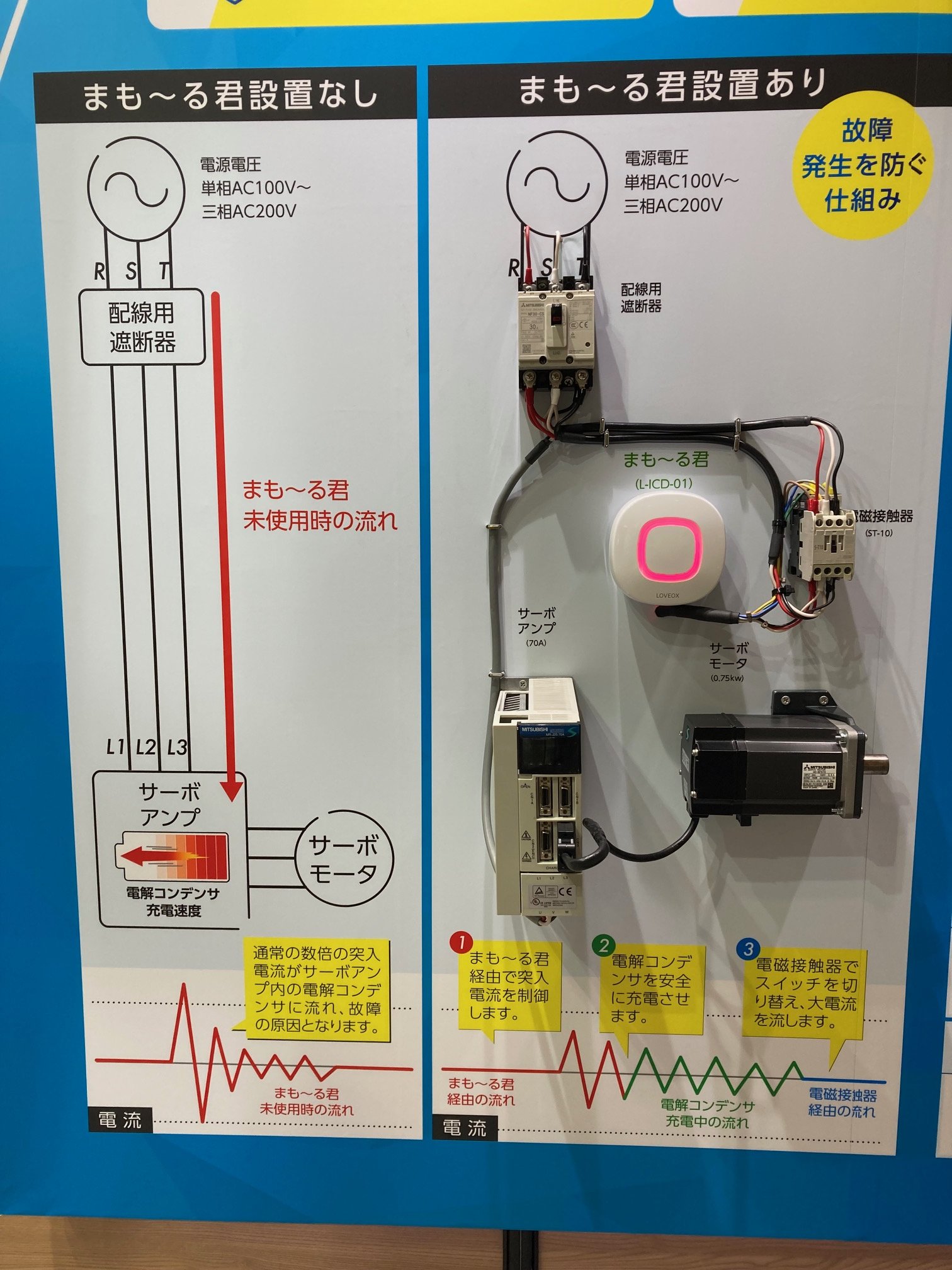 サーボアンプやPLCなどの前に設置、突入電流から電気機器の故障などを防ぐ仕組み作りをしていただければと思います。